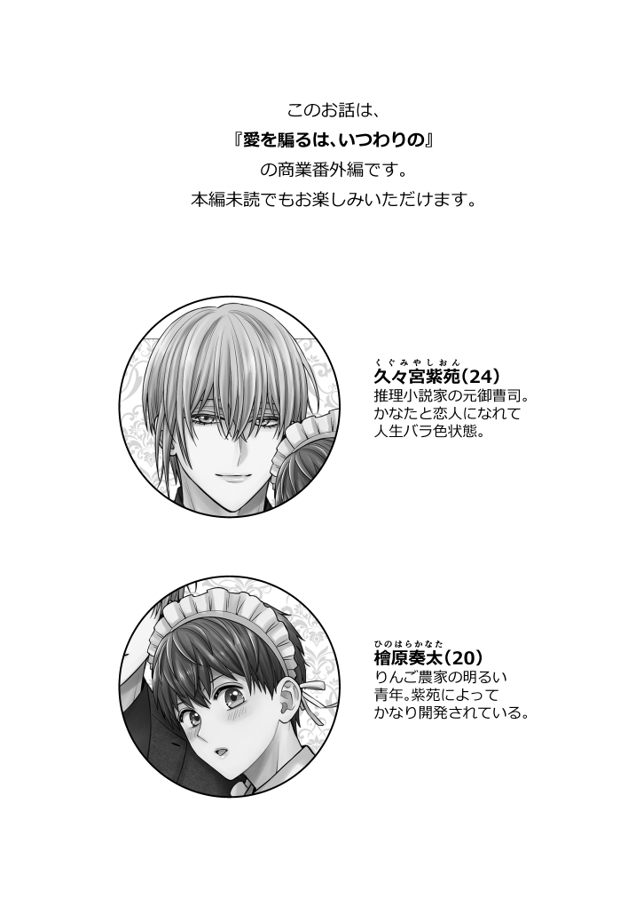 『愛を騙るは、いつわりの』商業番外編 正式に恋人同士となった久々宮紫苑と檜原かなた。 誕生日祝いのディナーの後にかなたが酔ってしまい、 休憩しようと入ったそこはなんと…ラブホテルだった! これはもう、メイド服プレイするしか、ない! 商業作品『愛を騙るは、いつわりの』番外編。 本編未読でもお楽しみいただけます。 表紙1ページ+本編26ページ+おまけ3ページ+その他4ページ 合計34ページ 本編モザイクなし、白線修正 …